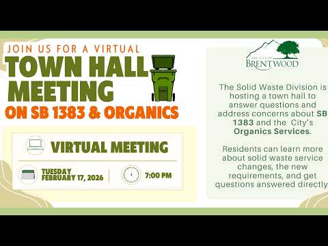 Brentwood public works officials told residents on a city-hosted Zoom meeting that the city will begin implementing California's SB 1383 organics-diversion requirements in February 2026 and will rely on curbside green-cart collection, education and audits rather than immediate fines.