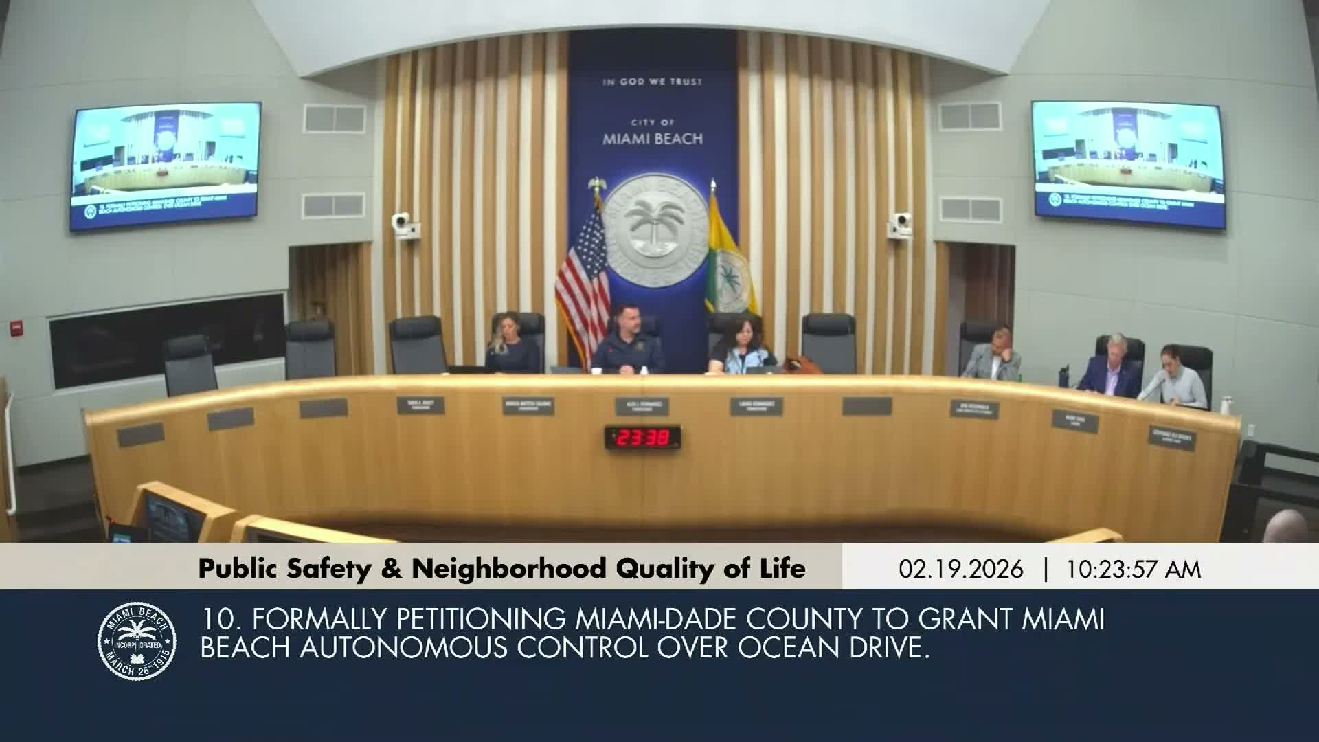 The committee voted to move a petition to Miami‑Dade County seeking autonomous control over Ocean Drive to the full commission while staff warned that federal/state standards would still apply; the committee also asked for a business town hall to prepare local businesses for FIFA/WORLD CUP activations and potential police/staffing costs.