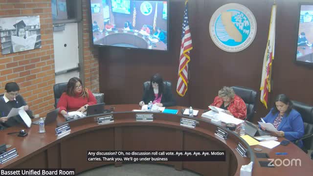 The Bassett Unified board accepted notice of completion for the Bassett High aquatic center, approved a pool-cleaning contract including chemicals and twice-weekly service, and tabled approval of an approved construction management providers list pending a facilities policy manual.