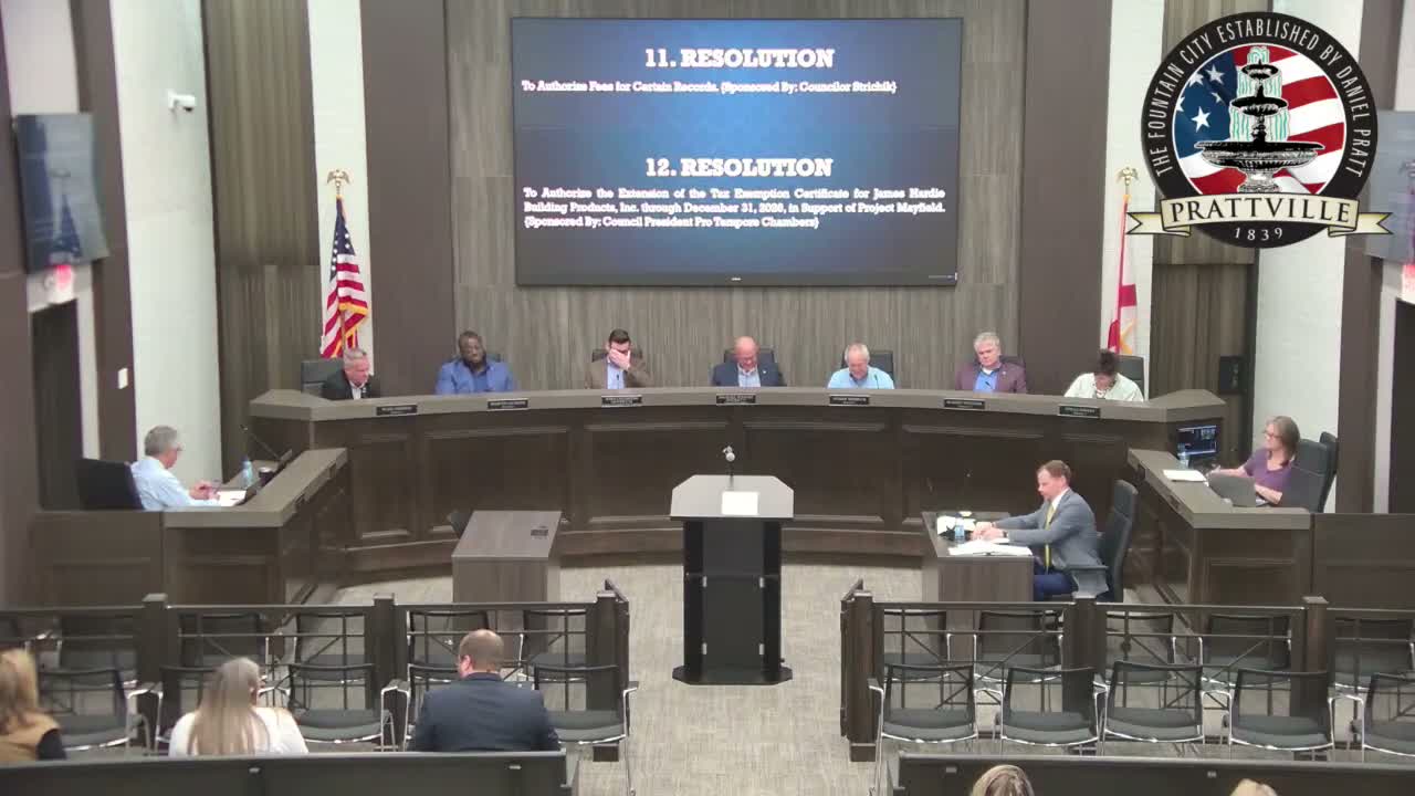 The Prattville City Council on Feb. 17 approved extending a tax-exemption certificate for James Hardie Building Products Inc. through Dec. 31, 2026 to allow the company to complete project-related equipment purchases and small construction work associated with Project Mayfield.