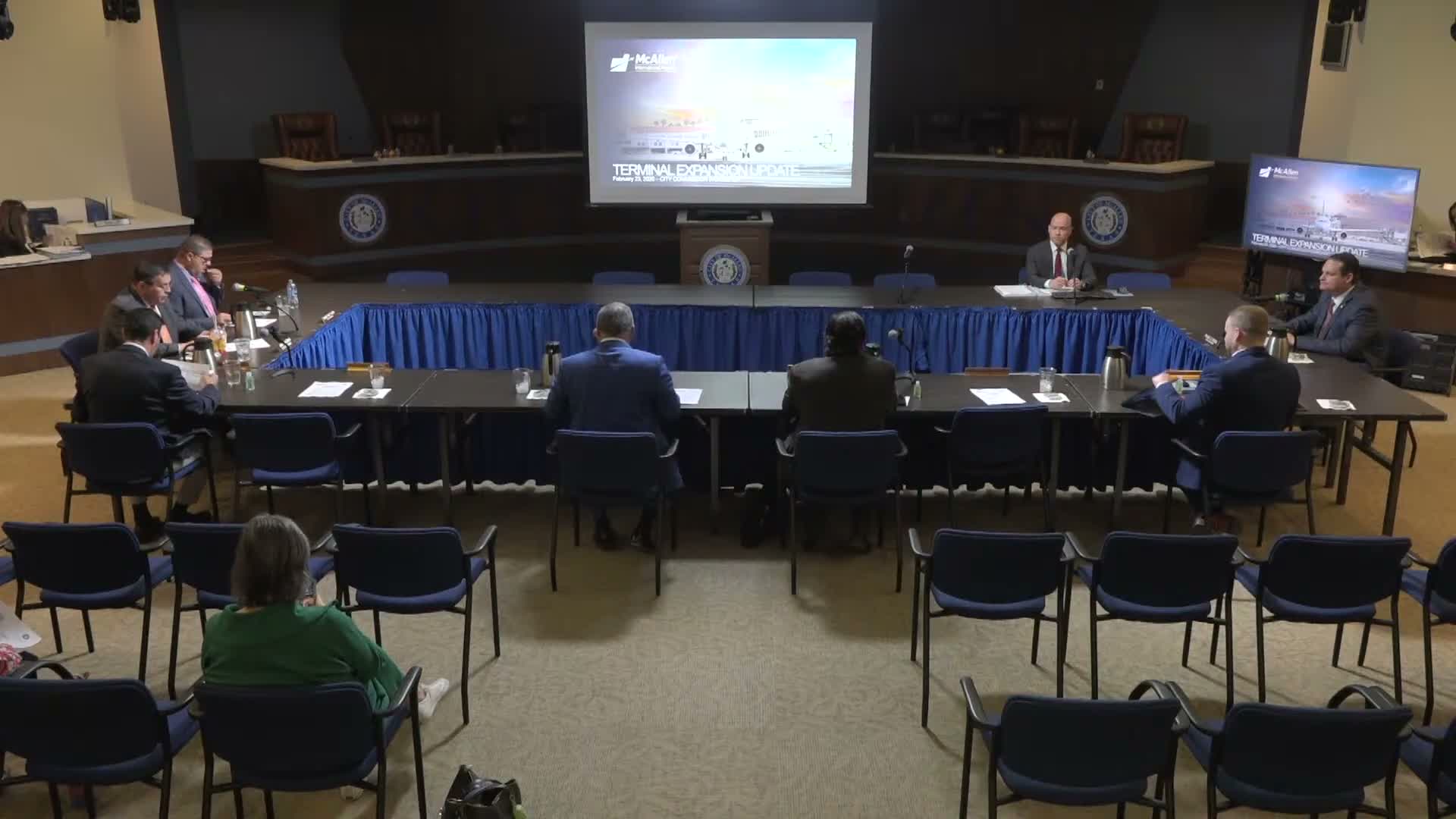 McAllen city staff on Tuesday presented a detailed update on a planned expansion of the city’s airport terminal that would increase passenger capacity and modernize aging mechanical and utility systems. "To date, we've gone through preliminary engineering report," the presenter said, describing a plan that would expand the lobby, increase ticket counter and baggage‑claim capacity, and build a new concourse to the west.
