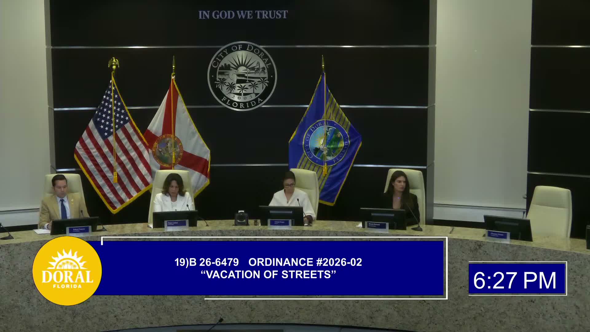 Votes at a glance - Item 60 (rental services for tents, tables, chairs): Council approved awards to Glen’s Tents and Table Rental Service Inc. and SBS Investments of Dade County Inc; Mayor Fraga successfully moved to shorten the initial contract period to one year with up to two one‑year renewals; motion passed unanimously. - Ordinance 20‑26‑01 (noise code amendments, first reading): approved to align rules for Doral Central Park and the amphitheater. - Ordinance 20‑26‑02 (process for vacation of streets, first reading): approved; the ordinance establishes a process but does not vacate any right‑of‑way. - Ordinance 20‑25‑22 (land‑use amendment, second reading): approved. - Ordinance 20‑25‑23 (rezoning to DMU, second reading): approved. - Ordinance 20‑25‑24 (development agreement, second reading): approved. - Site plan resolution for Doral Concourse: approved. - Ordinance 20‑25‑47 (industrial future‑land‑use text amendment, second reading): approved. - Ordinance 20‑25‑48 (special‑exception uses for indoor/outdoor recreation in industrial districts, second reading): approved.