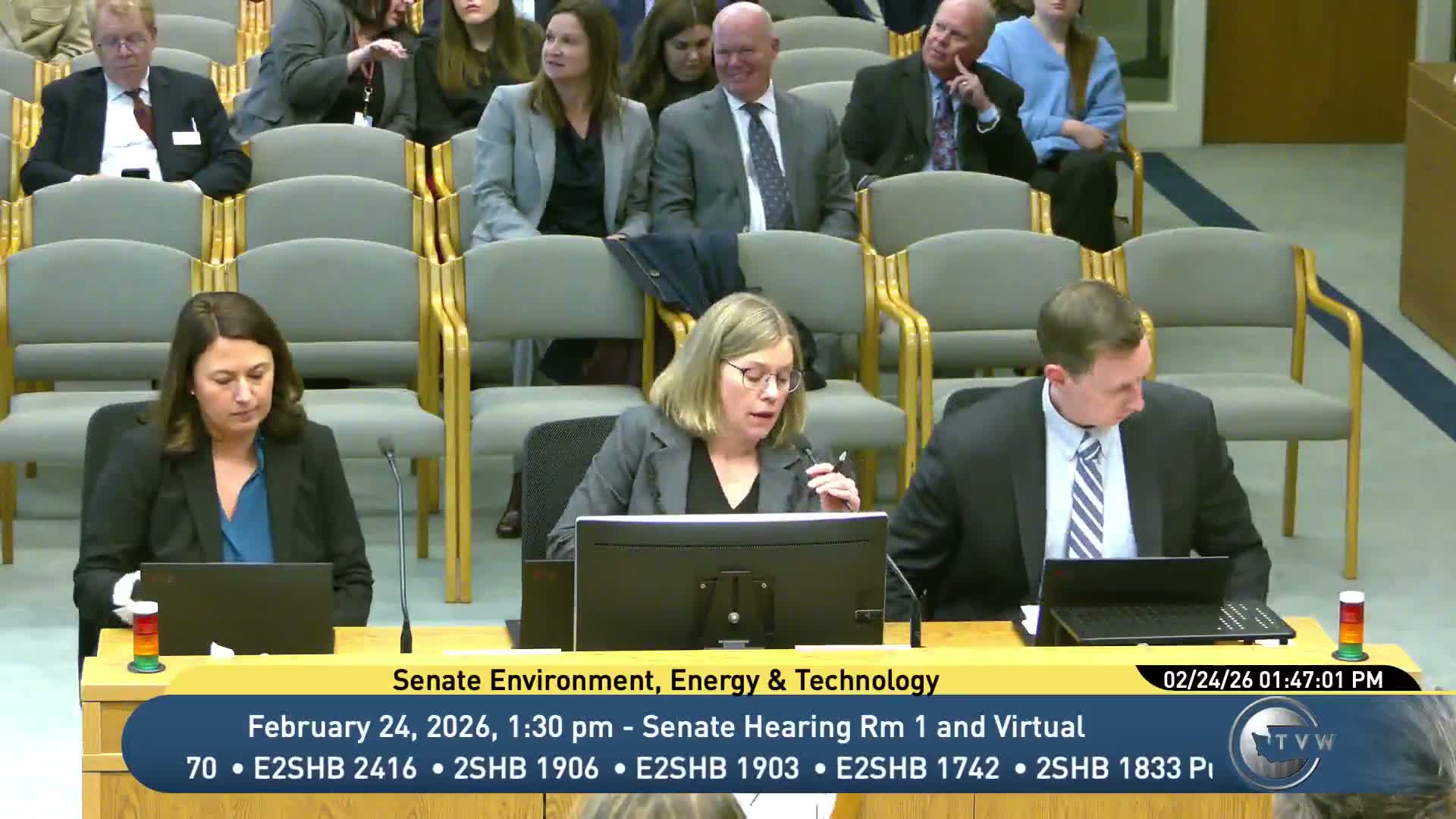 In executive session following a public hearing, the Senate Energy, Environment and Technology Committee adopted amendments and advanced multiple bills spanning distributed energy resources, data‑center regulation, artificial intelligence disclosures, waste‑to‑energy treatment under the Climate Commitment Act, and energy assistance.