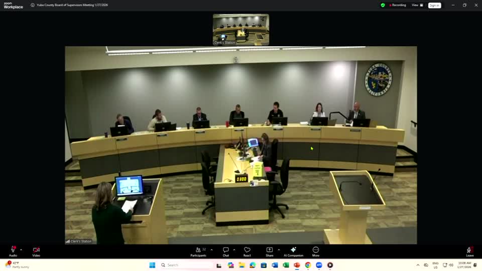 The Yuba County Board of Supervisors took a series of formal actions during the meeting: it approved a professional services agreement to operate two additional school‑based wellness centers (Marysville Joint Unified School District, Yuba County Office of Education and Peachtree Health; no county funding attached); updated the ad‑hoc committee assignments; adopted an event sponsorship policy; approved a memorandum of understanding with the Yuba Sutter Healthcare Council Foundation to install Narcan vending machines at the Life Building Center and the Health and Human Services lobby; approved an MOU to assign a county participant to the Sacramento Safe Streets (FBI) task force; approved an MOU to certify a privately owned peer‑support canine; and adopted text and map revisions to the county development code and zoning map (ordinance adoption passed unanimously).