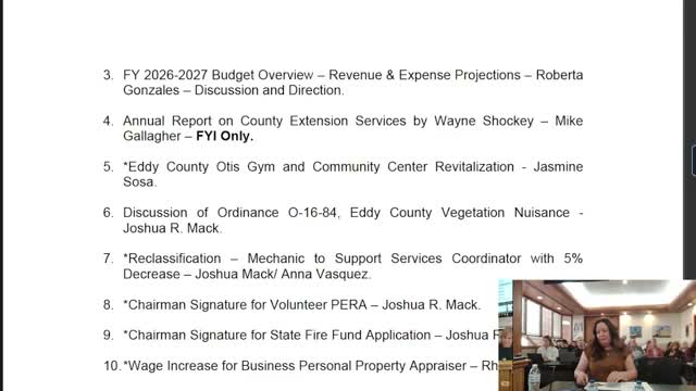 County finance staff presented the Eddy County preliminary outlook for fiscal year 2026-27, detailing collection results to date, revenue drivers and projected cash balances.