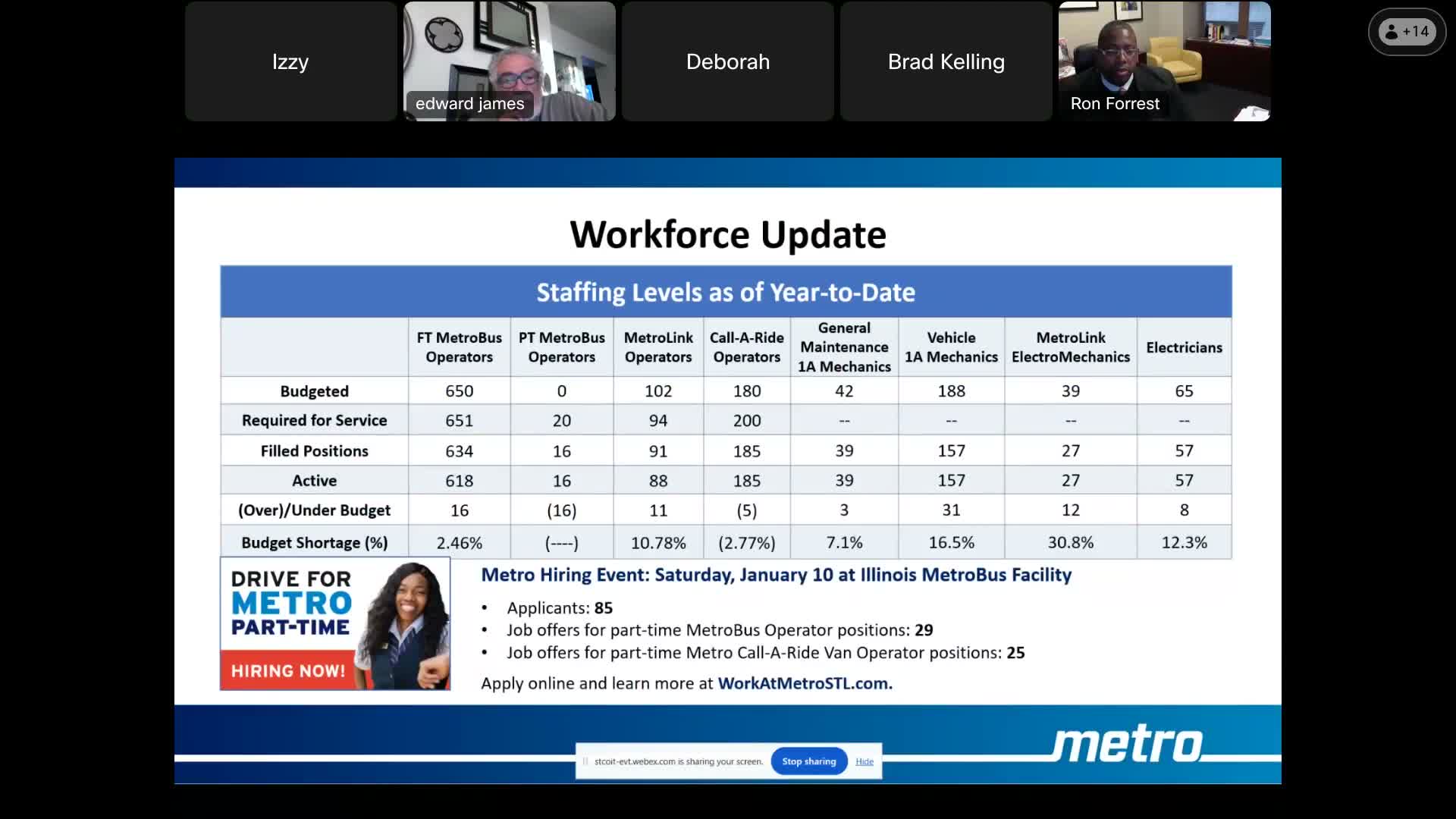 Forrest said Metrolink has 91 of 102 budgeted operators and expects a February class of 12 operators; however, that training will draw from the Metrobus pool and temporarily reduce bus operator counts. He also reported the maintenance workforce is short by about 54 mechanics, and the agency is pursuing apprenticeship and technical‑school hiring pathways pending Department of Labor approval to grow the maintenance pipeline.