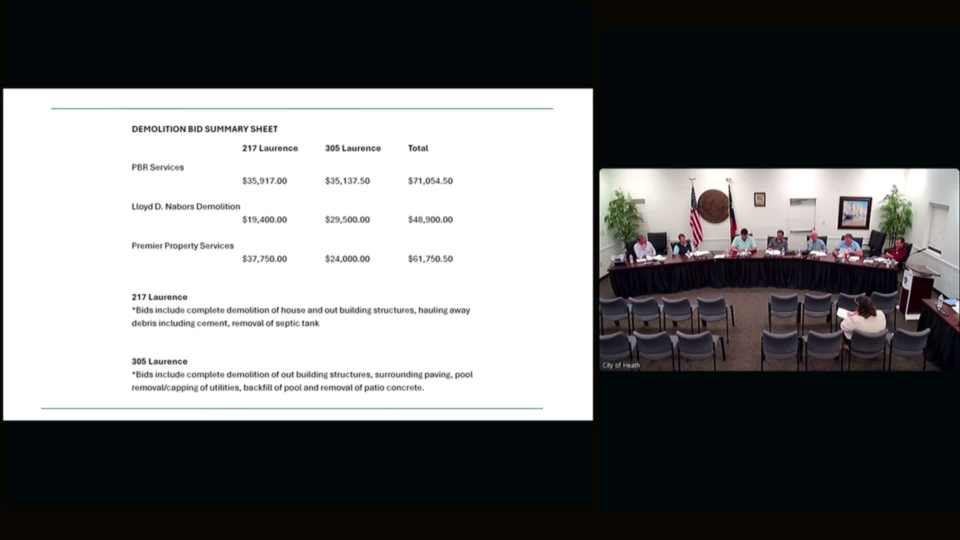 Mister Koepke presented bid summaries and said the bids included complete demolition of the house at 217 Lawrence Drive (with removal of structures and hauling debris) and removal of outbuildings, pool and septic at 305 Lawrence Drive. Koepke noted differences in bid scope and cost: some bids proposed full removal of concrete and slabs while others excluded below-grade concrete; one local bidder offered substantially lower per-square-foot pricing for concrete removal compared with a larger contractor. Koepke said the demolitions would include removal of septic systems where specified and that some contractors proposed fully removing the pool rather than simply filling it in. "Complete demolition of the house on 02/17," Koepke said while describing bid timelines and scope.