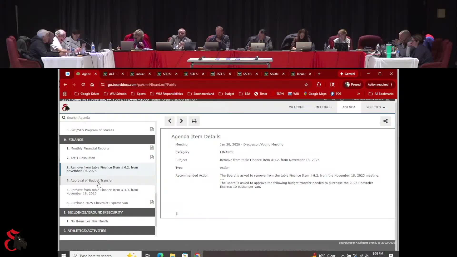 Board members debated whether to take a previously tabled finance item from the table and authorize a budget transfer to buy a 2025 Chevy Express 10-passenger van for $61,789 (vendor warranty included). The board first voted to take the item from the table by a narrow margin, then considered the budget-transfer motion itself.