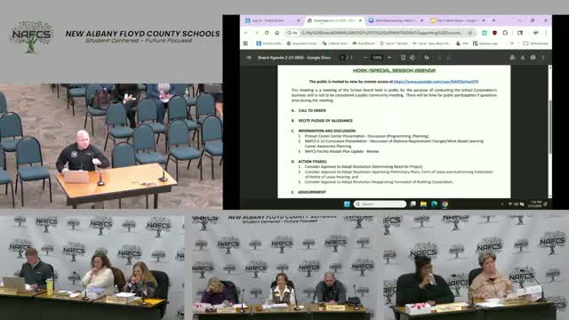 The New Albany'Floyd County School Board voted unanimously to adopt three interrelated resolutions authorizing the district to begin lease'financing steps for planned 2026 capital projects.