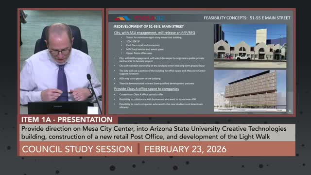 Mesa staff will release an RFQ/RFP to identify developers for 51–55 E. Main St., seeking a long‑term ground lease and a development that could include Mesa Arts Center programming, city offices and leasable Class A space; council asked for financial details and design flexibility before final agreement.