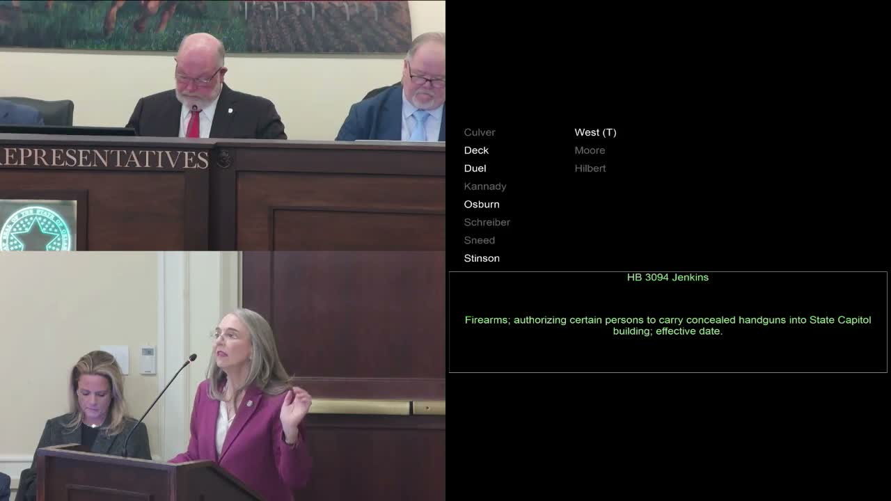 Representative Jenkins, the bill’s sponsor, said the measure was intended to allow vetted constituents to carry inside “the people’s house.” Jenkins told the committee that SDA cardholders undergo background checks with the local sheriff and the Oklahoma State Bureau of Investigation, submit fingerprints to the FBI and complete training; “an American and Oklahoman should never have to relinquish their second amendment right at the Capitol door,” Jenkins said.
