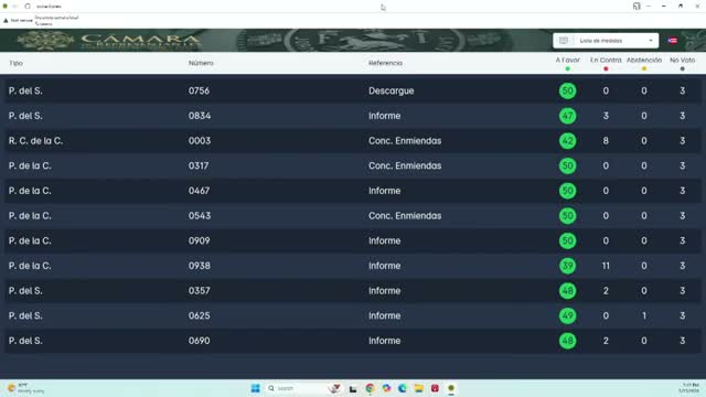 Votes at a glance (as read into the record): Cámara 3‑17 (50‑0); Cámara 467 (50‑0); Cámara 543 (50‑0); Cámara 909 (50‑0); Cámara 938 (39‑11); Senado 357 (47‑2); Senado 625 (49‑1); Senado 690 (48‑2); Senado 756 (50‑0); Senado 834 (47‑3); Concurrent resolution Cámara 3 (42‑8).