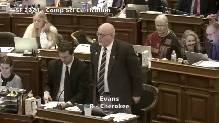 The Senate approved Senate File 2224, a bill revising computer-science education standards for grades 9–12 and practitioner preparation programs, after adopting an amendment that explicitly requires instruction related to artificial intelligence.