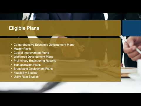 Speaker 2 outlined the types of plans eligible for funding, saying the program will consider comprehensive economic development plans, master plans, capital improvement plans, workforce development plans, preliminary engineering reports, transportation and broadband deployment plans, feasibility studies and utility rate studies. Speaker 2 also described who may apply: local units of government, federally recognized tribes, public authorities and associations, nonprofit organizations, local development districts and institutions of higher education.