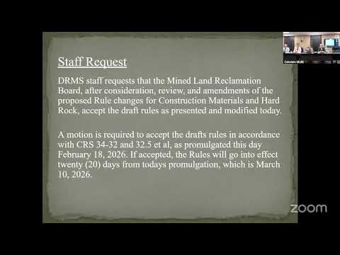The Mined Land Reclamation Board voted Feb. 18 to accept a package of updated hard‑rock and construction‑material rules, including a new 1‑10R reclamation‑only 'scoop‑and‑go' permit limited to small historic cleanup projects and subject to public notice, bonding and receiving‑facility requirements.