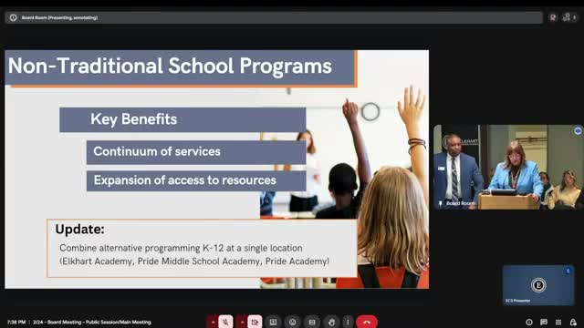 Hough said Phase 3 focuses on how to 'move people from A to B' with care and intentionality, and emphasized that while consolidation is necessary because of structural financial challenges, many implementation details are subject to revision in response to staff and family feedback. The administration recommended centralizing K‑12 nontraditional programs (Elkhart Academy, Pride Middle School Academy, and Pride Academy) into a single building to create a continuum of services and improve access to resources. District staff also proposed relocating PACE, Title I and Head Start preschool classrooms to Roosevelt STEAM Academy to co‑locate early learning programs.