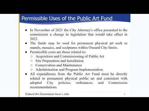 Arts Manager Julia Stratoculture told the commission the Public Art Fund holds $1,570,028.10 and reiterated that, following 2022 legislation changes, in-lieu development fees must be used for physical public art within Oxnard — acquisition, site work, conservation or project-related administration.