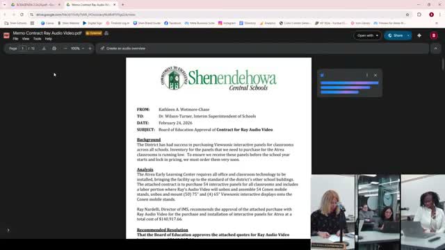The board approved a contract for audio‑video interactive panels (moved by Patrice, seconded by Mary Collin) and then approved a capital project change order that deleted an abatement scope item (moved by Andrea, seconded by Carla). The board also approved a tax‑certiorari settlement related to a Walmart property on Route 9 that reduced the assessed value for 2025 (moved by Mary Collin, seconded by Carl). Finally, the board approved a slate of staffing recommendations and add‑ons presented by district staff (moved by Hendrix, seconded by Patrice).