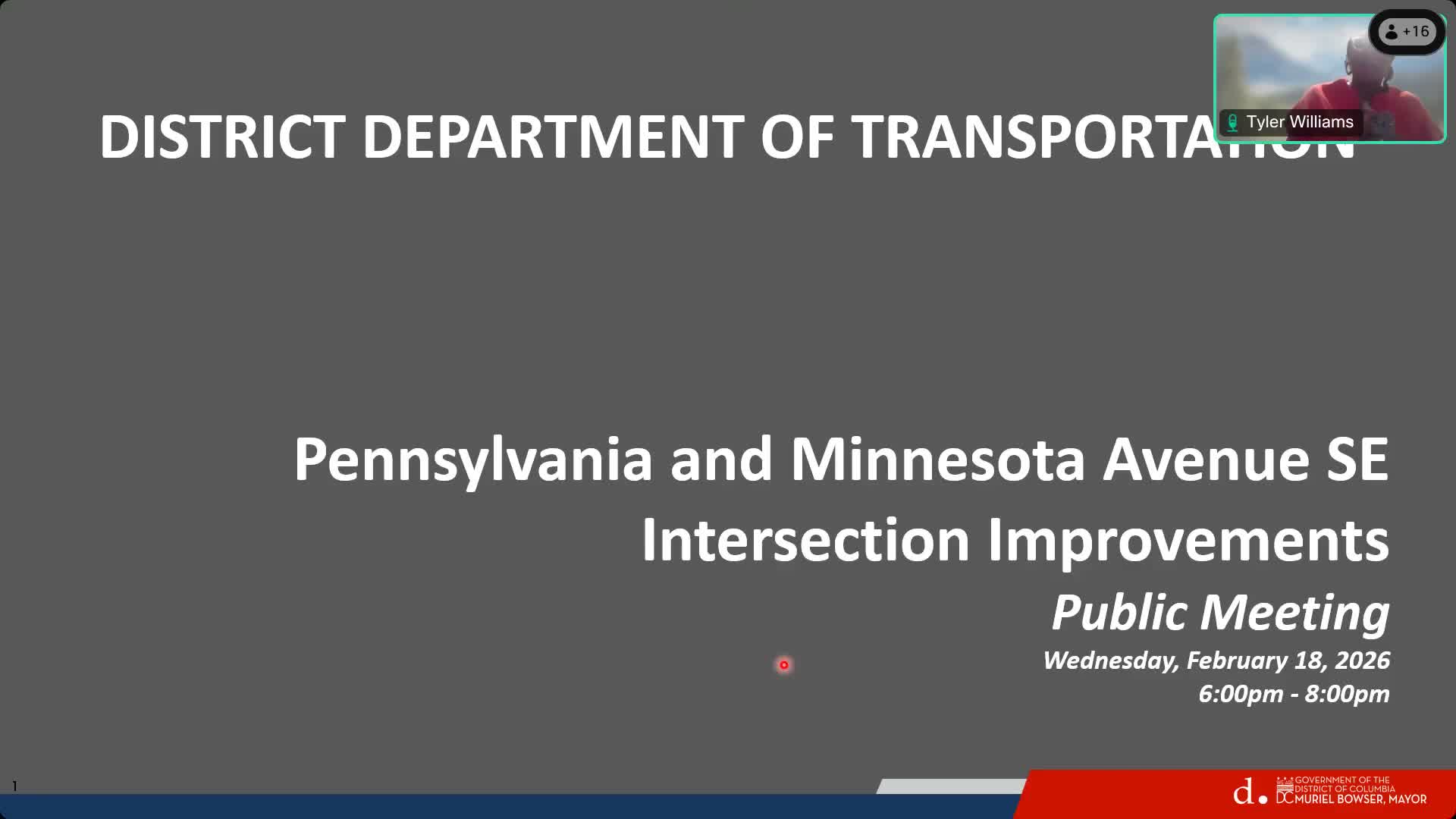 Tyler Williams, representing the District Department of Transportation, presented the agency’s final design for the Pennsylvania and Minnesota Avenue intersection, saying the plan consolidates diagonal slip lanes into a single signalized intersection and adds pedestrian, transit and safety improvements.