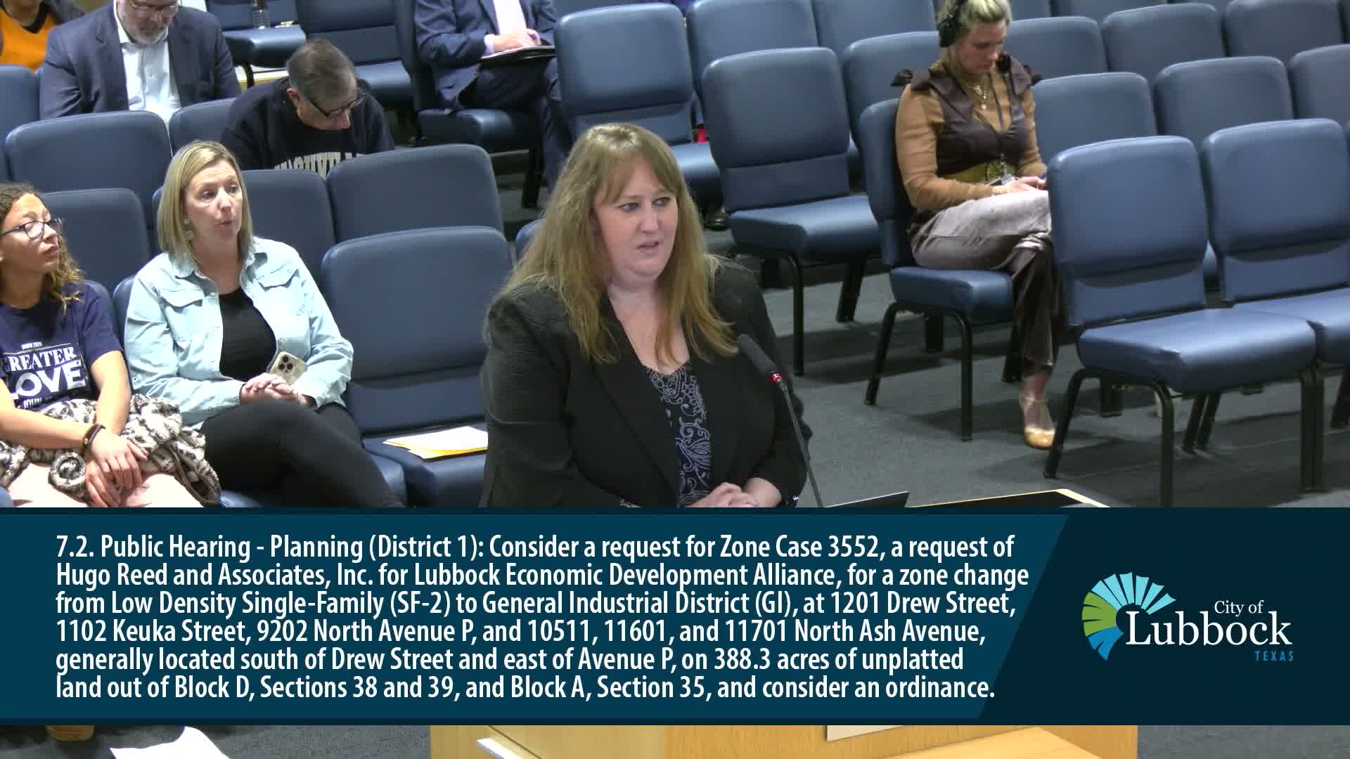 The Lubbock City Council voted 7-0 to approve zoning case 3552, changing a collection of parcels near Drew Street and FM 1294 from low-density single-family (SF-2) to General Industrial (GI).