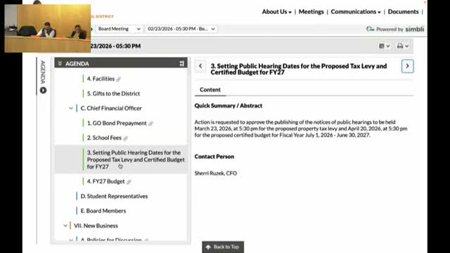 Boarders approved a resolution to redeem part of the 2021 general obligation bond and set public hearings on the 2026–27 levy and certified budget while staff warned that uncertain supplemental state aid and enrollment shifts will affect staffing and services.