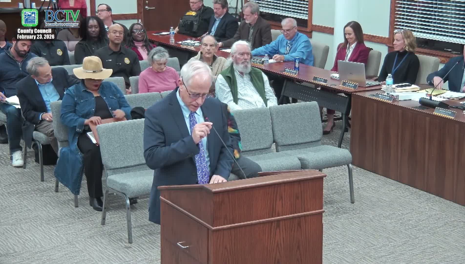 At the start of public comment, residents urged the county to press for a public acquisition of the Pine Island property after a federal judge dismissed a developer’s lawsuit as moot. County staff had told council earlier that the dismissal left the county's Cultural Protection Overlay (CPO) intact, but did not decide the CPO's validity on the merits.