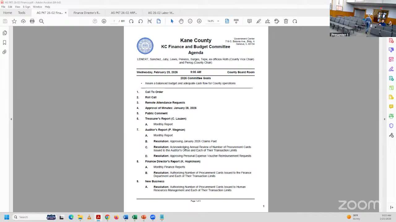 At a Feb. 25 Kane County Finance & Budget Committee meeting, the treasurer flagged inconsistencies between monthly management reports and audited statements, the county auditor recommended a Menards-rebate policy, and members approved an emergency purchasing ordinance plus more than 20 procurement-card resolutions and several grants and intergovernmental agreements.
