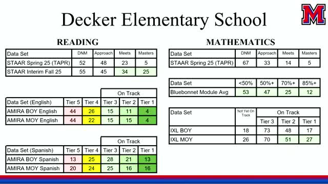 School leaders and trustees discussed assessment choices, how to ensure students are tested in the language most appropriate for them, and the challenge of comparing diagnostic tools (STAR, AMIRA, IXL) to state accountability scores.