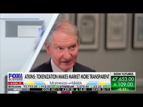 The interviewer then played a pre-recorded interview with Paul Atkins, identified in the segment as serving at the SEC, who described tokenization. "Tokenization is the idea of using ... smart contracts or ... tokens on chain to be able to ... represent, say, an underlying security," Atkins said. He added that "that tokenized security is a security and would be subject to SEC rules by law," and argued blockchain records could make ownership more transparent and could shorten clearance and settlement times.