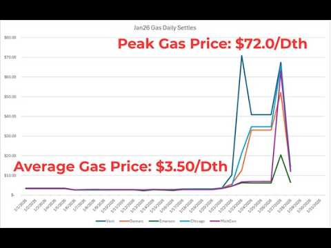 The presentation included a month‑long gas price chart that Peterson said showed wholesale gas near $3 per decatherm for most of January before spiking to roughly $72 per decatherm around the 23rd. He said wholesale power prices rose in step with gas and reached about $800 per megawatt‑hour in MISO’s day‑ahead market.