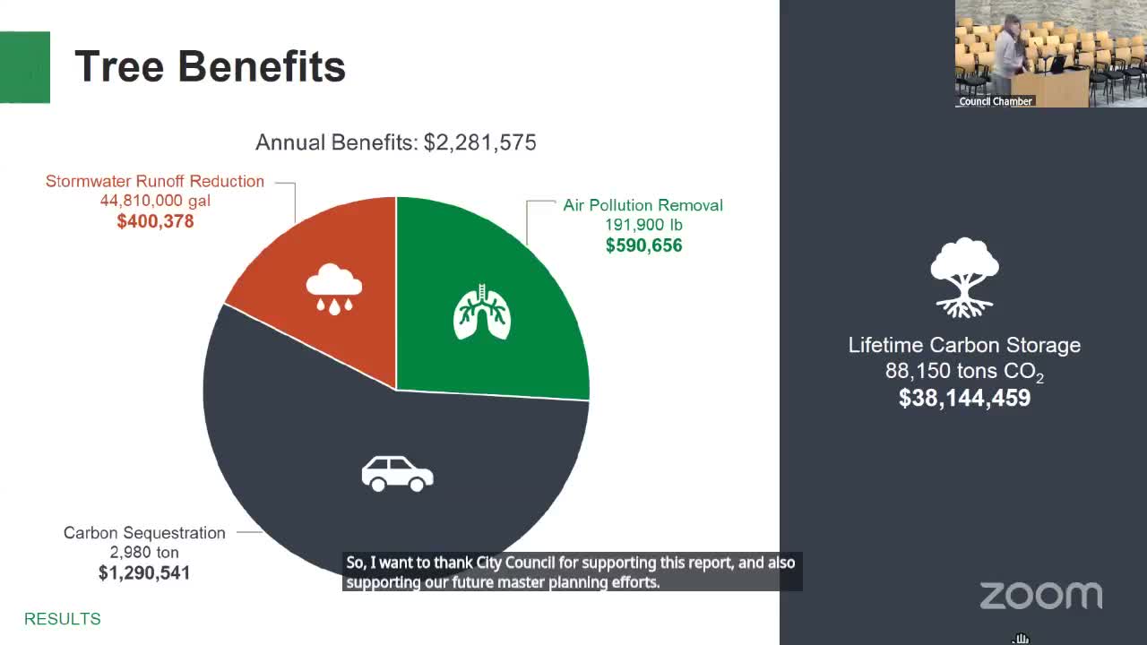 Sam, the city forester, presented results of a 2025 urban canopy assessment conducted with Davey Research Group and said the study found "41% tree canopy in the city." The consultant used recent NAIP imagery, parcel-level analysis and priority maps to guide where plantings would have the greatest environmental and socioeconomic impact.