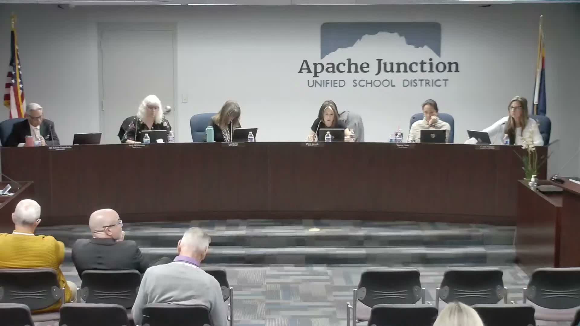 The Apache Junction Unified School District governing board voted Feb. 24 to approve several personnel and compensation changes, including a 1% base salary increase for employees, new step‑less pay bands for classified staff and administrators, and a revision to contractual pay treatment for employees on ESI.