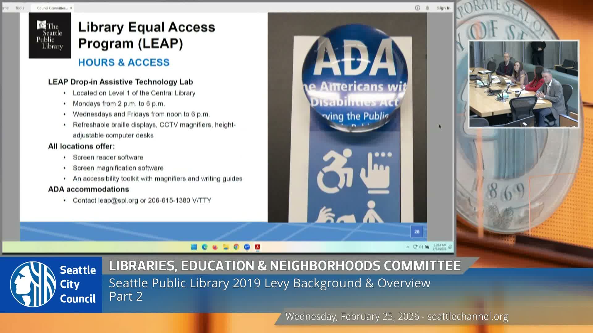 Kirsten Nelson, SPL’s government relations lead, updated the committee on state‑level funding for the Washington Talking Book & Braille Library. Nelson said Representative Thomas (who represents West Seattle) introduced a proviso to restore funding, and that provisos for talking book and braille have been included in both the House and Senate budgets to date.