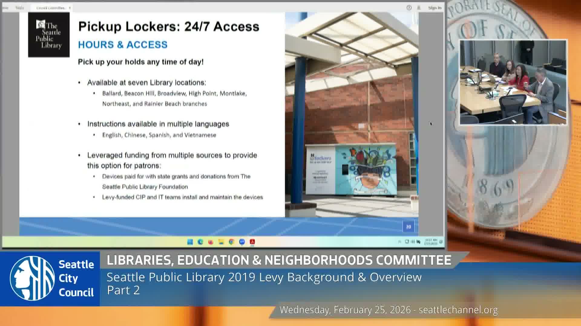 Presenters told council the library installed seven 24/7 holds lockers (donor and state funded), operates mobile and books-by-mail services for homebound patrons, runs a LEAP assistive tech lab at Central, and supports Kaleidoscope Play & Learn and Story Squad pilot with Seattle Public Schools.