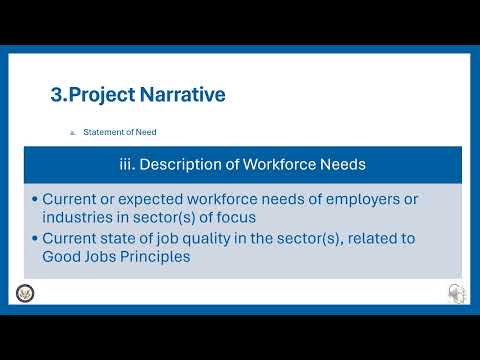 For the statement of need, applicants must describe the service area and challenges with verifiable data (for example, wages and workforce demographics) and explain industry sector choices. Dunn noted applicants may use the Climate and Economic Justice Screening Tool as one data source. The statement of need also requires applicants to identify target populations (historically marginalized groups) and explain recruitment plans; the populations chosen in the application are binding during implementation and cannot be expanded without modification.