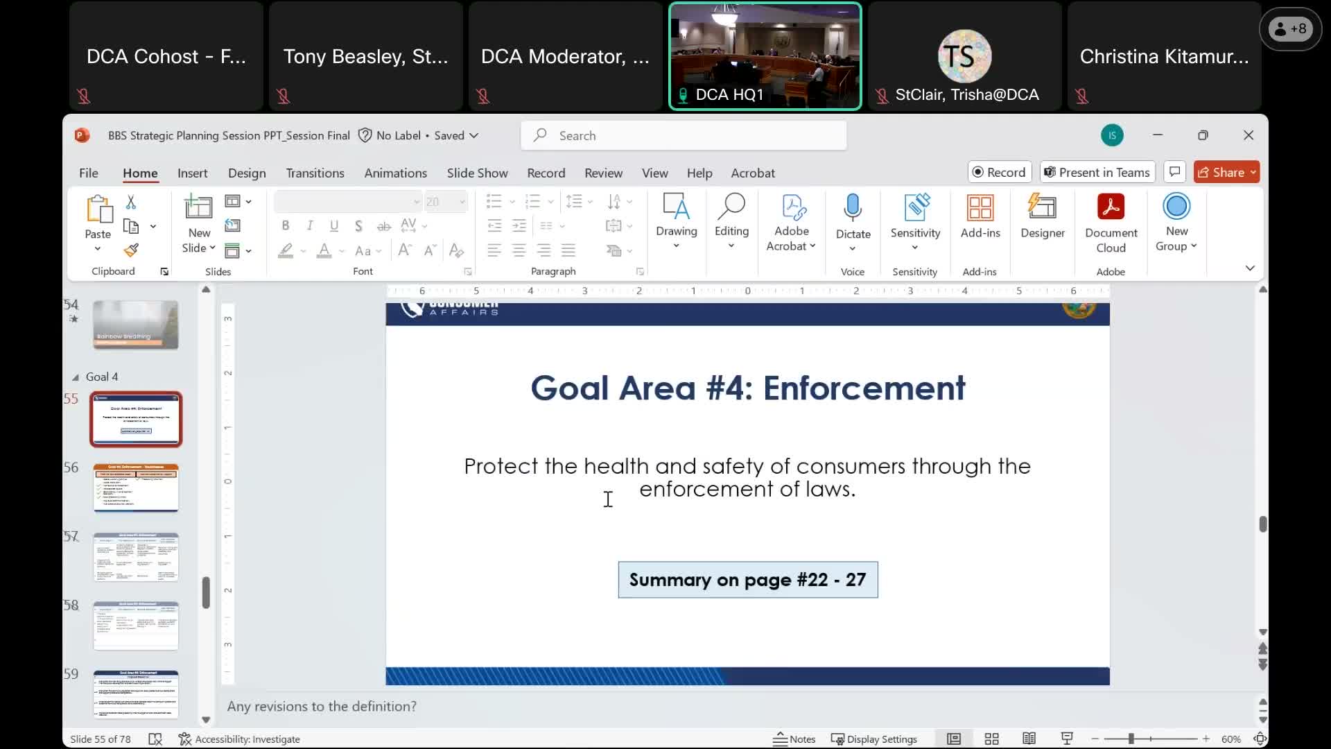 The Board of Behavioral Sciences spent part of the strategic planning session discussing enforcement objectives aimed at protecting consumers through improved monitoring, audits, and communications.
