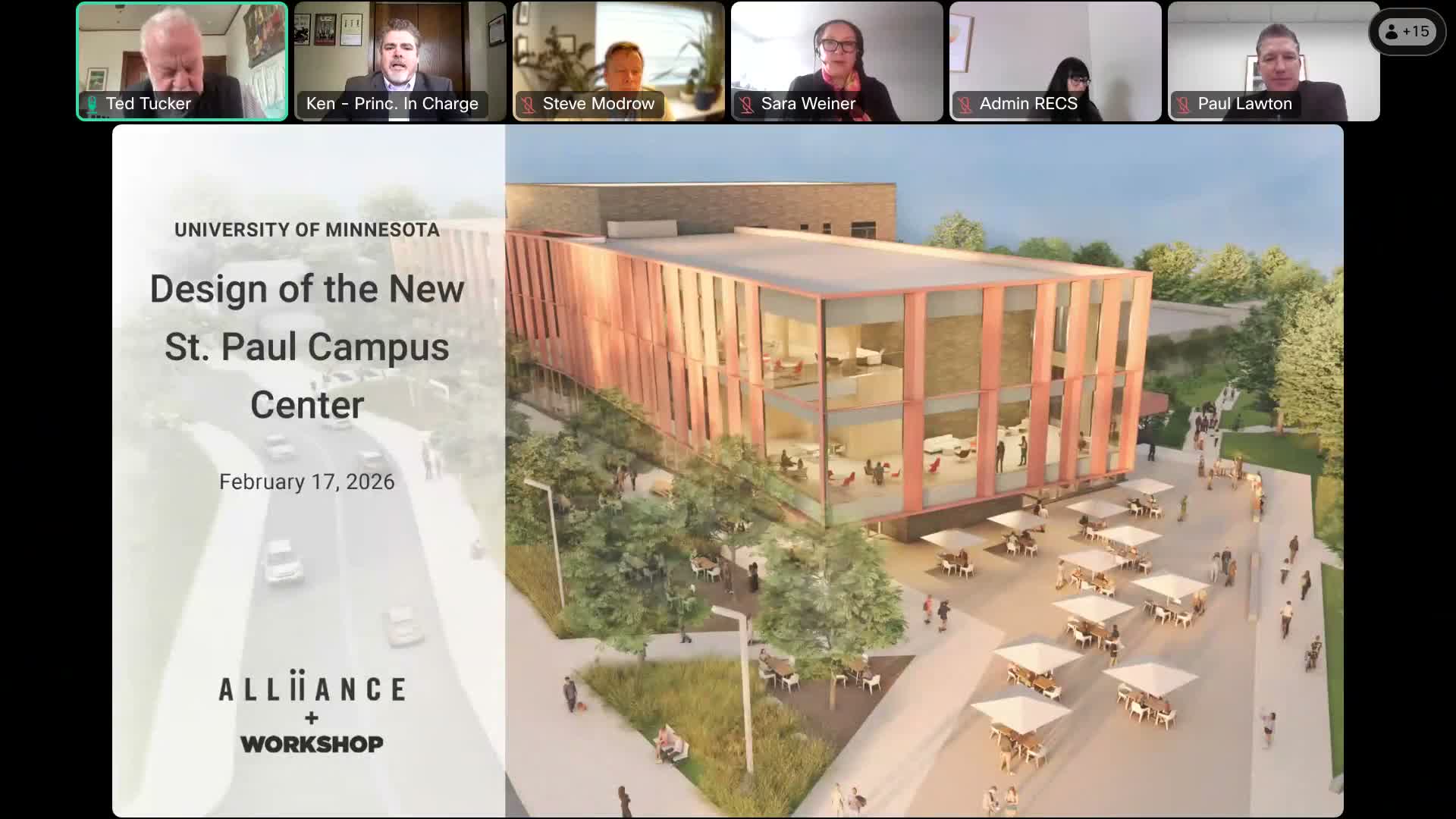 Alliance/Workshop presented a predesign for the University of Minnesota Saint Paul campus center, emphasizing program integration of student union and library functions, mass-timber construction to reduce weight and improve character, and strategies to meet Minnesota's B3 energy targets; the board will announce its selection decision shortly.