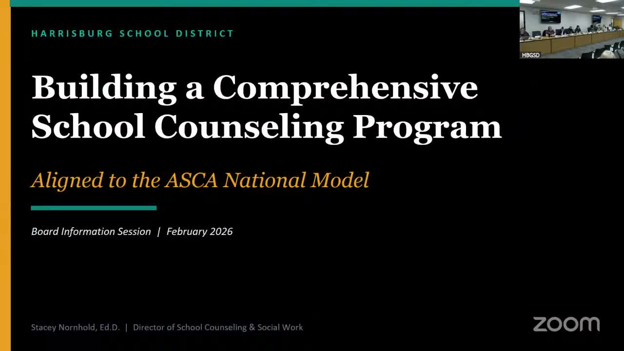 Harrisburg School District staff presented a comprehensive K–12 counseling plan aligned to the ASCA national model and described Year 1 implementation steps and barriers to a full district rollout next school year.