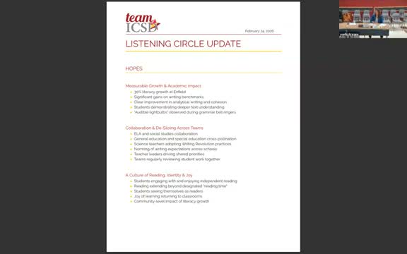 Presenter (S4) listed top concerns surfaced in listening circles: scheduling constraints that limit co-teaching and intervention time, the need for targeted professional development beyond decoding and fluency, and requests for more opportunities for teachers to collaborate across schools.