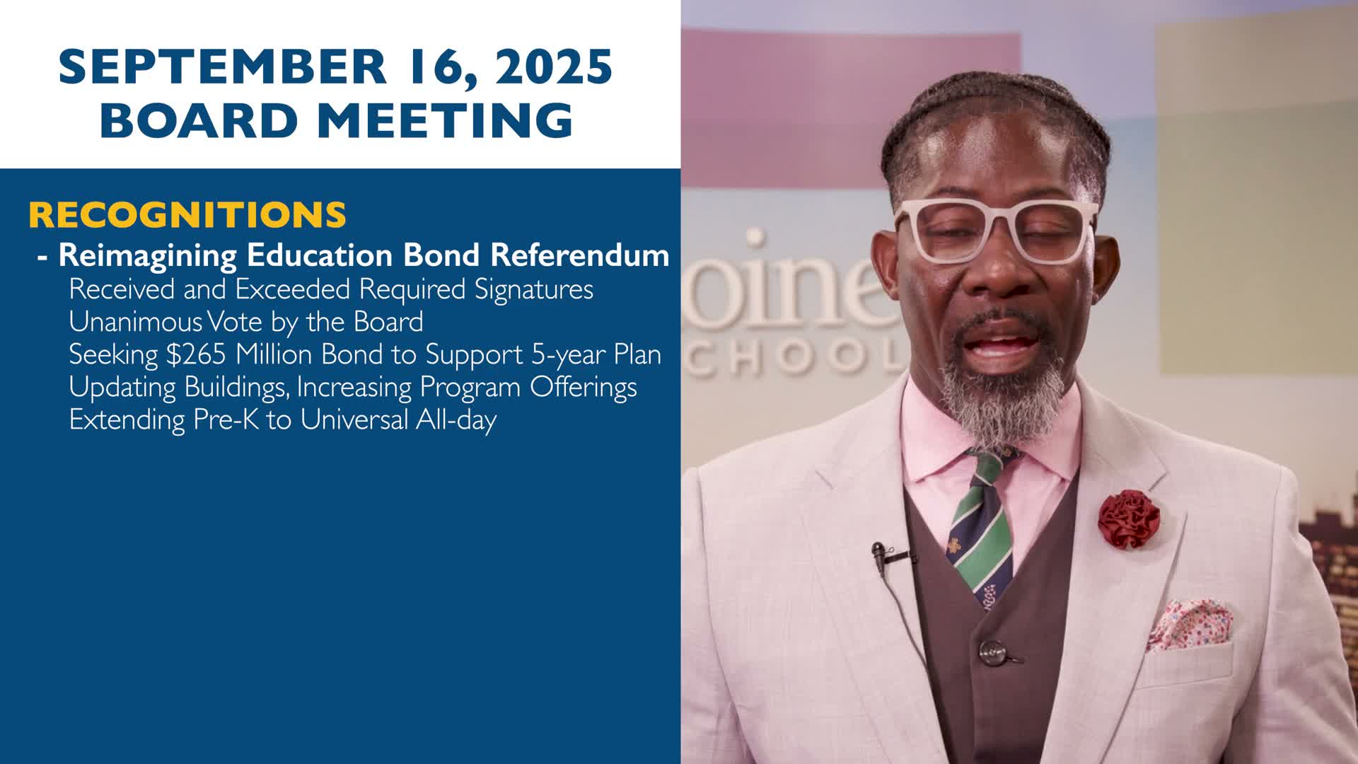 The measure is intended to fund the district’s five‑year Reimagining Education plan, the staff member said. The district described planned uses as building upgrades (the buildings were described as averaging 72 to 80 years old), expansion of "signature schools," growth of career and technical education programs, and extension of full‑day pre‑K so eligible children and their parents have access to all‑day preschool.