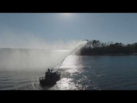 Presenter showcases new fireboat on Lake Lanier, saying it boosts water and land firefighting capabilities