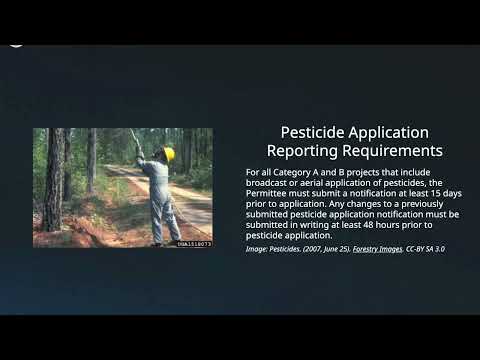 For projects that include broadcast or aerial pesticide application, the presenter said permittees must submit a pesticide application notification at least 15 days prior to application and must provide written notice of changes at least 48 hours before application. Notifications must include project location information, materials, application equipment and an assigned certification statement. The presenter listed locations where pesticide application is prohibited under the order, including watercourse and lake protection zones (WLPZs) and areas burned within the prior three years on slopes greater than 30% unless at least 50% ground cover is present.