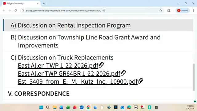 After presentations and public comment, the board voted unanimously to encumber up to $200,000 toward a jointly funded Township Line Road reconstruction project; Lower Nazareth Township will act as the grantee and administer the bidding process.
