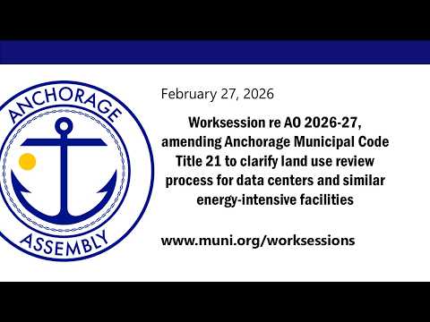 The Anchorage Assembly on Feb. 27 reviewed Ordinance O-2026-27, a work-session presentation that would add a distinct 'data center' land-use category to Title 21 and require conditional-use review for energy-intensive facilities.