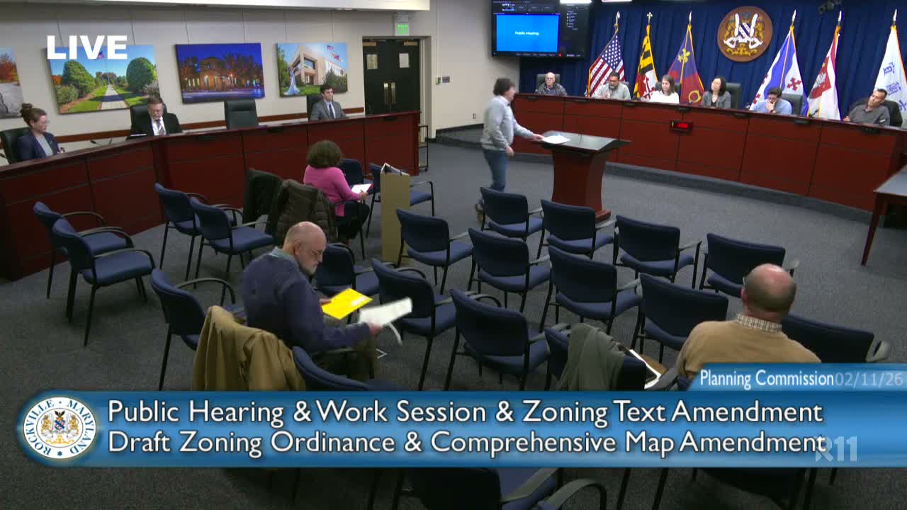 The commission did not take a formal, recorded action on Tower Oaks at the Feb. 11 meeting. Several commissioners urged staff to reflect neighborhood concerns in the recommendation memo and for the Mayor and Council to consider alternative zoning outcomes where appropriate. Staff said the planning timeline is constrained by Mayor & Council direction but agreed to include neighborhood testimony and to better document how the proposed zones would affect access, emergency response and compatibility.