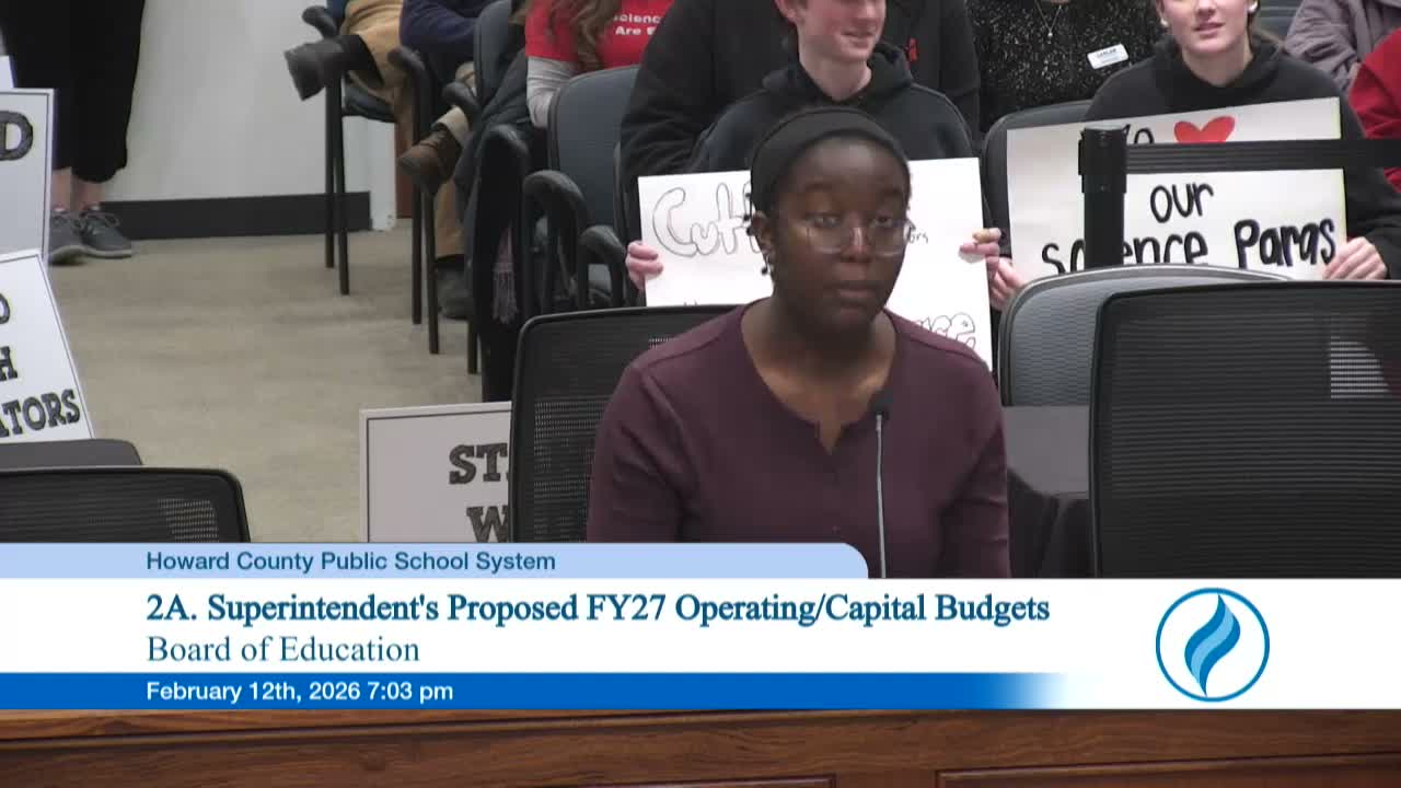 Dozens of students, educators and community members told the Howard County Board of Education on Feb. 12 that proposed FY27 budget cuts to media specialists and science paraeducators would damage classroom instruction, hands‑on science learning and equitable access to library and technology services.