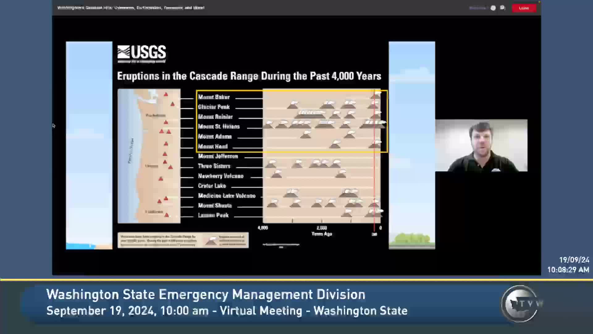 Alyssa of the Washington Emergency Management Division described local and distant tsunami threats from Cascadia and Alaska, advised how to get official tsunami alerts and siren information, and urged practicing walk-time evacuation routes and preparing go-bags.