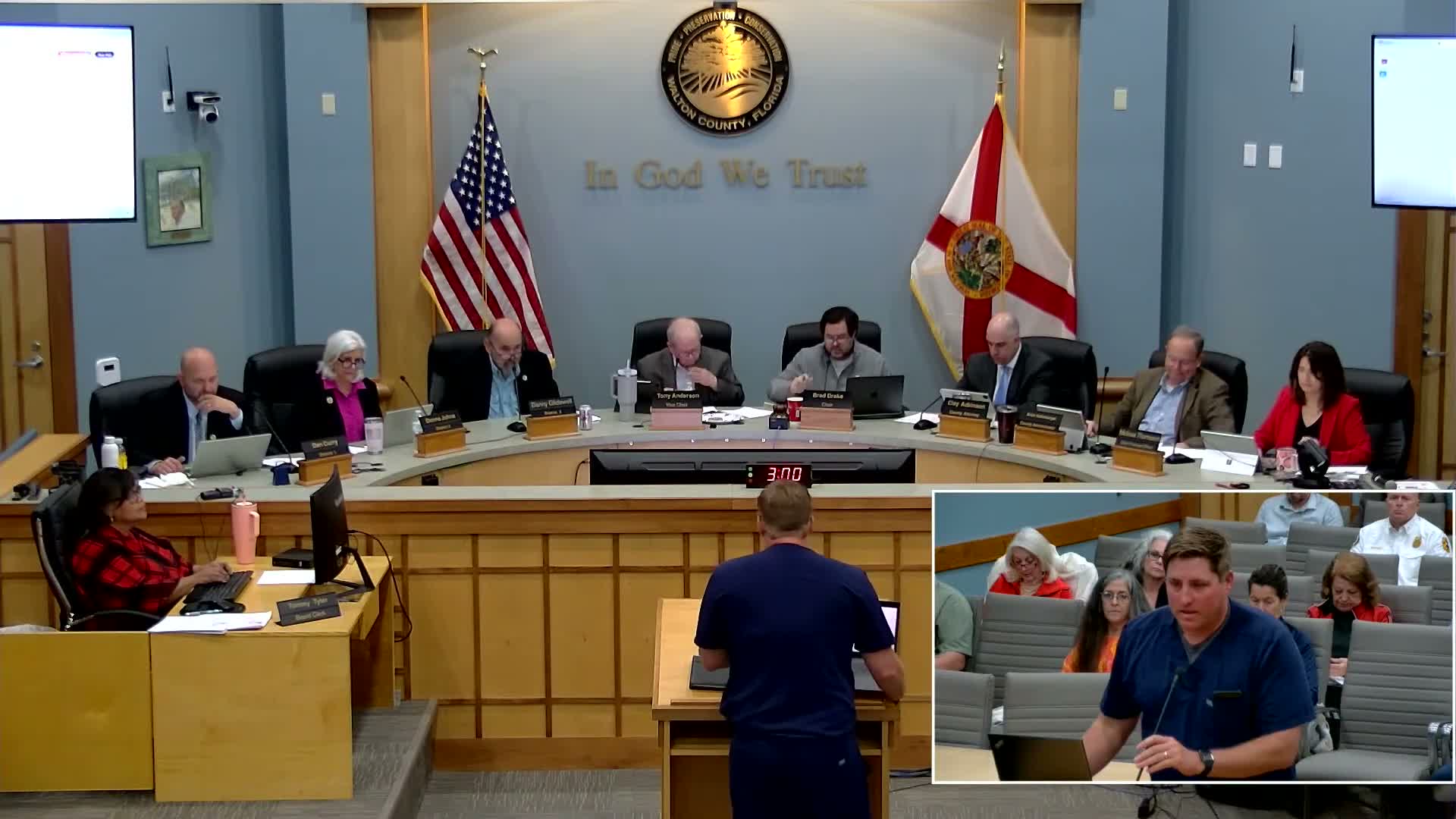 Joel Duncan, volunteer president of South Walton Little League, told the Board that registration for the 2026 season topped "over 520 kids," producing 52 teams and creating a scheduling bottleneck with only three usable fields. He said the league needs room to play 12 required games for older divisions and that, as currently configured, the county cannot guarantee one game and one practice per team each week. (Joel Duncan)