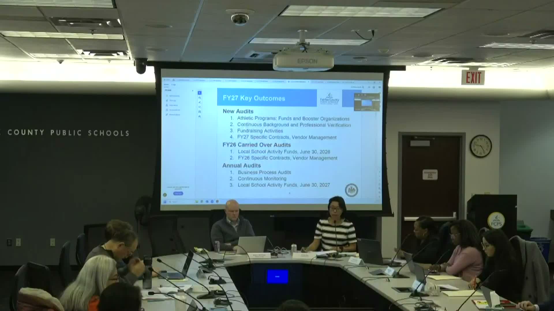 Esther Ko of the Office of Auditor General presented the office's fiscal‑year‑2027 risk assessment and proposed audit plan to the Fairfax County School Board Audit Committee on March 2.