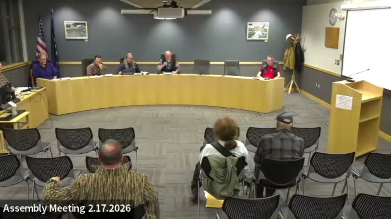 At its Feb. 17 meeting the assembly passed a third-reading ordinance vacating part of 7th Street to create a residential lot, adopted a 10% harbor-fee increase effective March 1, and approved a second reading to rezone a tideland parcel into the Marine Industrial Overlay; the body also approved two public-works awards.